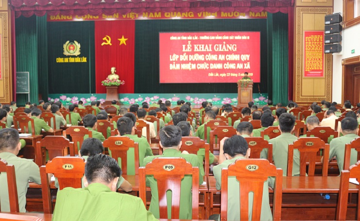 Sáng ngày 22/5/2019, tại Hội trường Công an tỉnh, Công an tỉnh Đắk Lắk phối hợp với Trường Cao đẳng Cảnh sát nhân dân II tổ chức khai giảng Lớp bồi dưỡng cán bộ Công an chính quy đảm nhiệm chức danh Công an xã; đồng chí Đại tá Nguyễn Thị Xuân - Phó Giám đốc Công an tỉnh dự, chỉ đạo buổi lễ. Tham dự buổi lễ có đồng chí Đại tá Nguyễn Văn Hạnh - Phó Hiệu trưởng Trường Cao đẳng Cảnh sát nhân dân II, các đồng chí lãnh đạo khoa, phòng, bộ môn của Trường Cao đẳng Cảnh sát nhân dân II, lãnh đạo các đơn vị, Công an huyện, thị xã, thành phố và 240 học viên tham gia lớp bồi dưỡng.