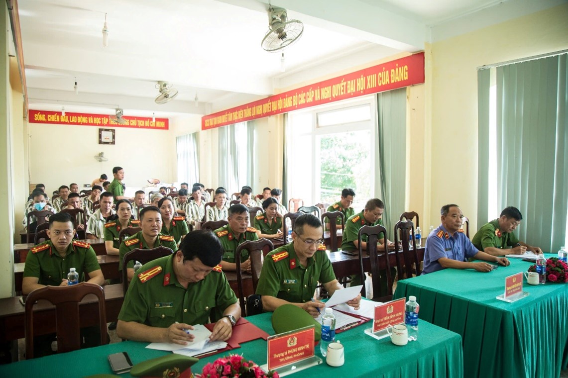 Đồng chí Đại tá Trần Bình Hưng, Phó Giám đốc Công an tỉnh Đắk Lắk; đại điện Lãnh đạo Phòng Cảnh sát QLHC về TTXH, Giám thị Trại tạm giam; đại diện Lãnh đạo Viện kiểm sát nhân dân tỉnh cùng với cán bộ chiến sỹ và phạm nhân trong diện đặc xá được cấp thẻ căn cước