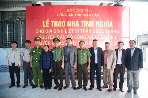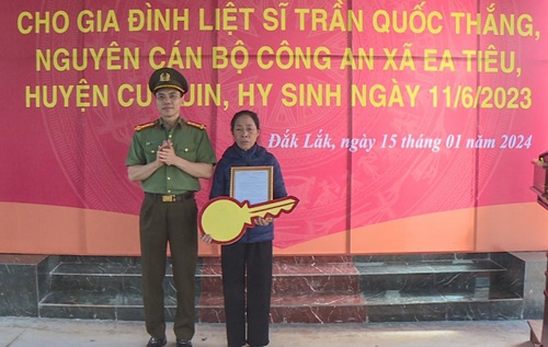 Sáng 15/01/2023, Công an tỉnh Đắk Lắk đã tổ chức Lễ trao nhà tình nghĩa cho gia đình Liệt sỹ Trần Quốc Thắng nguyên cán bộ Công an xã Ea Tiêu, huyện Cư Kuin hy sinh ngày 11/6/2023.
