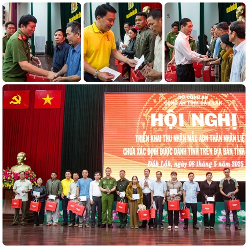 Ngày 08/5/2025, Công an tỉnh Đắk Lắk phối hợp với Cục CSQLHC về TTXH, Bộ Công an và Công ty GeneStory tổ chức Hội nghị và Chương trình thu nhận mẫu ADN cho thân nhân các liệt sĩ chưa xác định được danh tính trên địa bàn tỉnh. Đồng chí Đại tá Trần Bình Hưng - Phó Giám đốc Công an tỉnh chủ trì Hội nghị cùng với sự tham gia đại diện các Sở, ban, ngành liên quan, đại diện chỉ huy đơn vị Công an cấp xã cùng các mẹ và thân nhân các gia đình liệt sỹ.