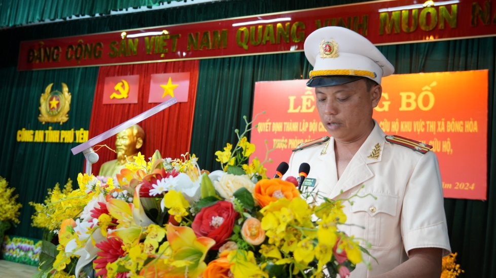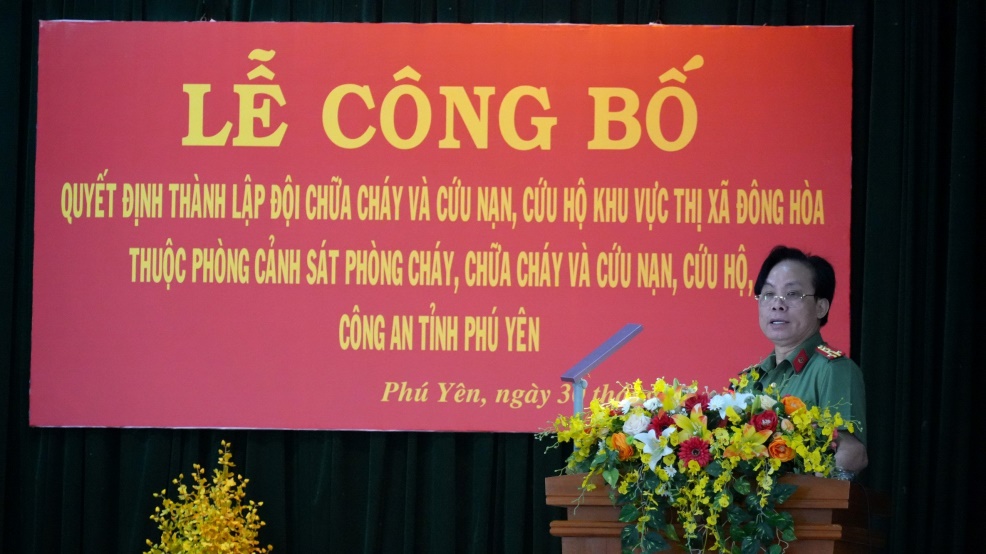 Đại diện lãnh đạo Phòng Tổ chức cán bộ đã công bố Quyết định của Giám đốc Công an tỉnh về việc thành lập Đội chữa cháy và cứu nạn, cứu hộ khu vực thị xã Đông Hòa và các quyết định điều động và bổ nhiệm chỉ huy Đội. Trụ sở làm việc của Đội đóng tại Khu công nghiệp Hòa Hiệp, được trang bị đầy đủ các phương tiện, xe chữa cháy và các thiết bị chuyên dụng khác, với chức năng, nhiệm vụ giúp Trưởng phòng Cảnh sát Phòng Cảnh sát phòng cháy, chữa cháy và cứu nạn, cứu hộ tổ chức thực hiện công tác chữa cháy và cứu nạn, cứu hộ trên địa bàn thị xã Đông Hòa và các khu vực phụ cận. Phát biểu chỉ đạo và giao nhiệm vụ, đồng chí Đại tá Trần Trọng Hiền, Phó Bí thư Đảng ủy, Phó Giám đốc Công an tỉnh chúc mừng Đội chữa cháy và cứu nạn cứu hộ khu vực thị xã Đông Hòa thuộc Phòng Cảnh sát phòng cháy, chữa cháy và cứu nạn, cứu hộ chính thức thành lập và đi vào hoạt động, yêu cầu lãnh đạo Phòng Cảnh sát phòng cháy, chữa cháy và cứu nạn, cứu hộ chỉ đạo Đội chữa cháy và cứu nạn cứu hộ khu vực thị xã Đông Hòa nhanh chóng ổn định tổ chức, bố trí, sắp xếp, phân công nhiệm vụ cụ thể cho từng cán bộ, chiến sĩ; quyết liệt triển khai thực hiện, hoàn thành xuất sắc các nhiệm vụ, chỉ tiêu công tác, góp phần bảo đảm an ninh, an toàn phòng cháy, chữa cháy và cứu nạn, cứu hộ phục vụ công cuộc phát triển kinh tế - xã hội của địa phương./.