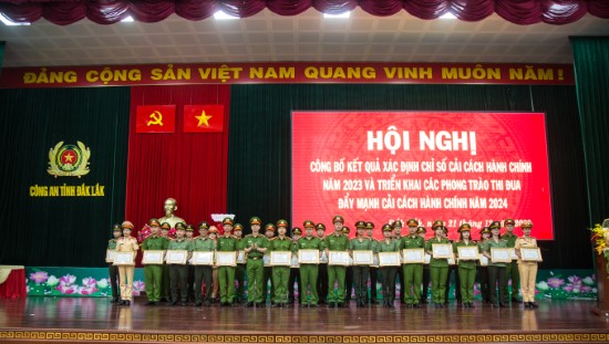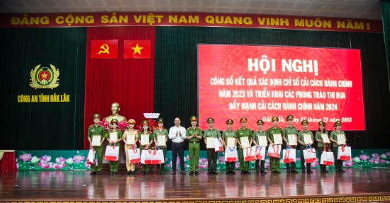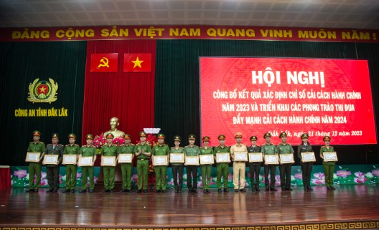 Sáng ngày 21/12/2023, Công an tỉnh Đắk Lắk tổ chức Hội nghị công bố Chỉ số cải cách hành chính (CCHC) năm 2023 và phát động các phong trào thi đua về CCHC năm 2024, Đ/c Đại tá Trần Bình Hưng – Phó Giám đốc Công an tỉnh chủ trì Hội nghị; tham dự Hội nghị có 335 đại biểu là đại diện lãnh đạo Sở Nội vụ, Sở Thông tin và Truyền thông, Văn phòng UBND tỉnh, lãnh đạo Công an tỉnh và lãnh đạo, chỉ huy Công an 3 cấp. Đ/c Thiếu tướng Phạm Công Nguyên – Cục trưởng Cục Pháp chế và cải cách hành chính, tư pháp, Bộ Công an vì lý do bận công tác không tham dự Hội nghị theo Giấy mời của Công an tỉnh đã gửi gửi lẵng hoa chúc mừng.