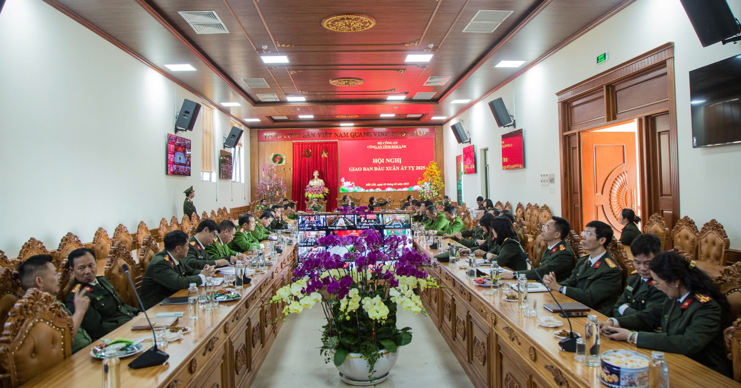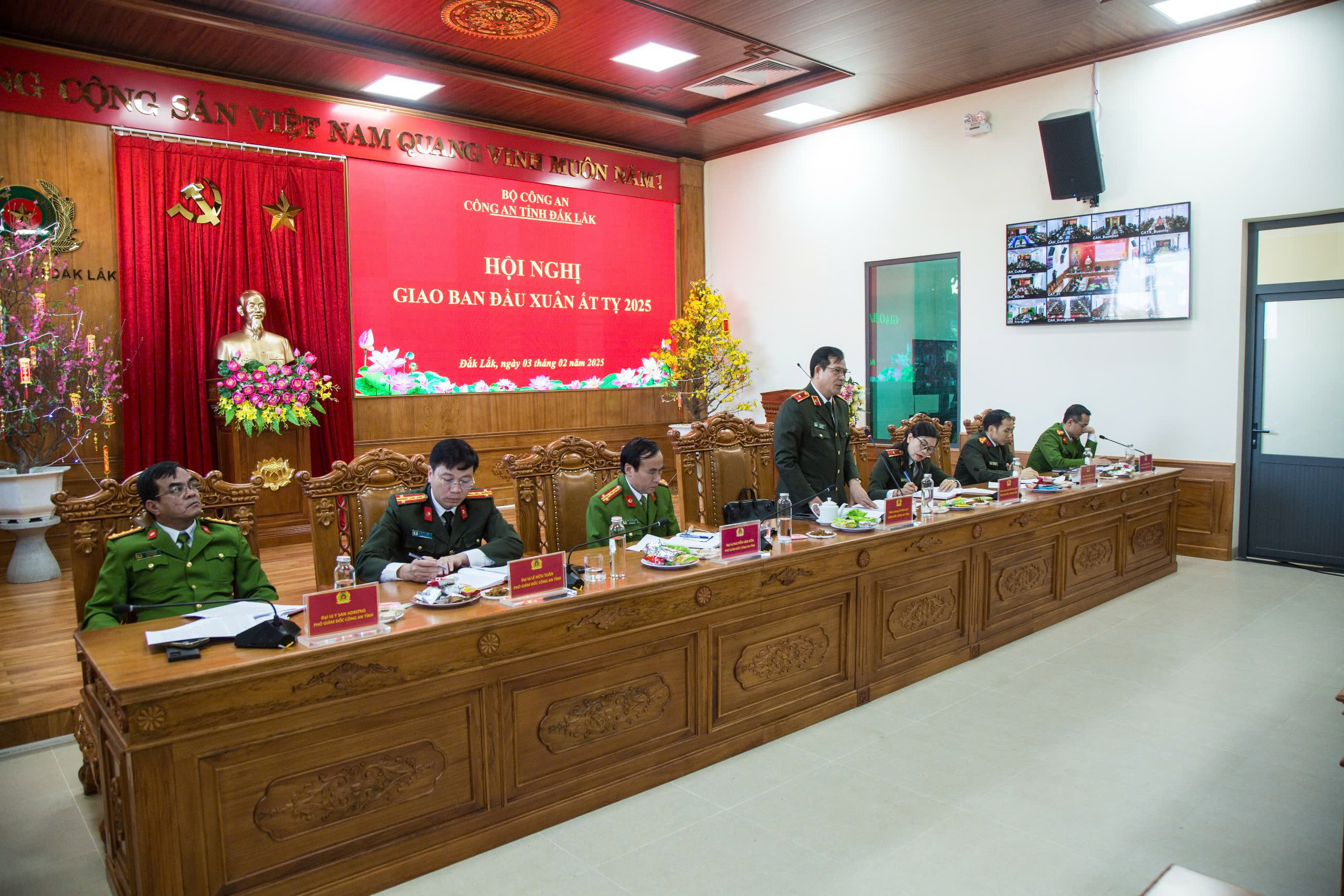 Sáng ngày 03/02/2025, Công an tỉnh Đắk Lắk tổ chức Hội nghị giao ban đầu Xuân Ất Tỵ năm 2025 do đồng chí Thiếu tướng Lê Vinh Quy - Giám đốc Công an tỉnh chủ trì. Hội nghị được tổ chức dưới hình thức trực tuyến tại 02 điểm cầu (Công an tỉnh và Công an cấp huyện) với sự tham dự của Ban Giám đốc Công an tỉnh, thủ trưởng các đơn vị trực thuộc, Trưởng Công an các huyện, thị xã, thành phố.