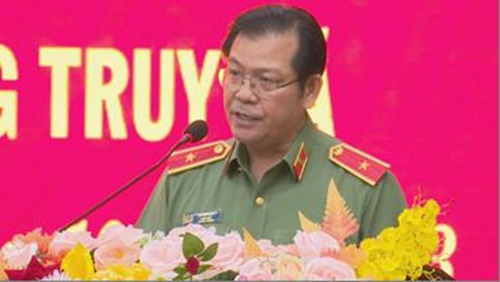 Thiếu tướng Lê Vinh Quy, Ủy viên Ban Thường vụ Tỉnh ủy, Bí thư Đảng ủy, Giám đốc Công an tỉnh phát biểu chỉ đạo tại hội nghị.