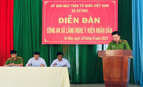 Vào sáng ngày 18/8/2023, tại Nhà văn hóa xã Cư Bao, Công an xã phối hợp với Ủy ban Mặt trận Tổ quốc Việt Nam xã tổ chức Diễn đàn Công an xã lắng nghe ý kiến nhân dân. Về dự diễn đàn có đồng chí Thiếu tá Lê Đình Đô - Phó Trưởng Công an thị xã, đồng chí Phạm Ngọc Tiên - Bí thư Đảng ủy, Chủ tịch UBND xã, các đồng chí trong Thường trực Đảng ủy, UBND xã, Chủ tịch Ủy ban MTTQ xã, đại diện các đội nghiệp vụ, 100% lực lượng Công an xã và hơn 100 bà con nhân dân trên địa bàn.