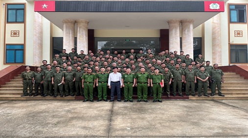 Đại biểu, tập thể Chỉ huy Công an xã chụp ảnh lưu niệm cùng lực lượng tham gia bảo vệ an ninh, trật tự ở cơ sở.