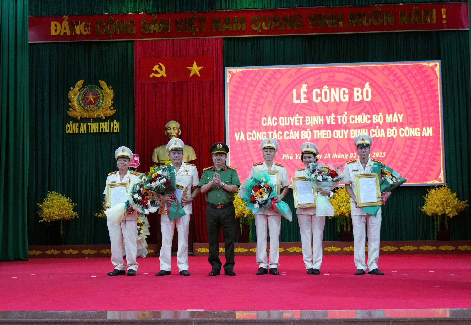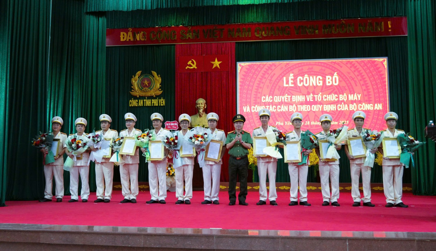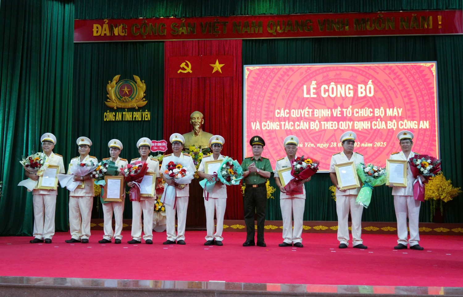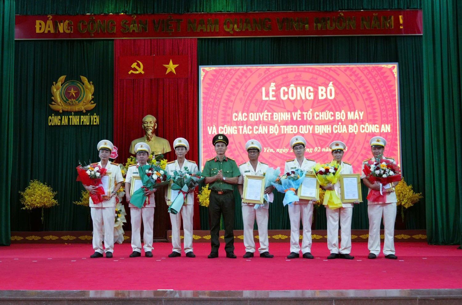 Ngày 28/02, Công an tỉnh Phú Yên tổ chức Lễ công bố các quyết định về sắp xếp tổ chức bộ máy và công tác cán bộ theo mô hình tổ chức bộ máy mới của Bộ Công an. Dự lễ có đồng chí Cao Thị Hòa An – Phó Bí thư Thường trực Tỉnh ủy, Chủ tịch HĐND tỉnh cùng lãnh đạo các sở, ban, ngành và đơn vị liên quan.