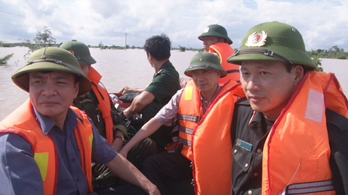 Đ/c Đại tá Vũ Hồng Văn - Giám đốc Công an tỉnh (bên phải) tham gia Đoàn Công tác của tỉnh Đắk Lắk do đồng chí Bùi Văn Cường - Bí thư Tỉnh ủy dẫn đầu khảo sát, nắm tình hình vùng ngập lụt