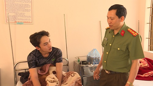 Đại tá Lê Văn Tuyến - Giám đốc Công an tỉnh Đắk Lắk thăm Trung sỹ Nguyễn Như Khang tại bệnh viện