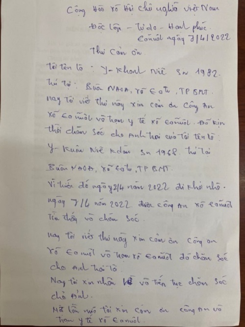 Thư cảm ơn của anh Y Khanh gửi Công an và Trạm Y tế xã Ea Nuôl