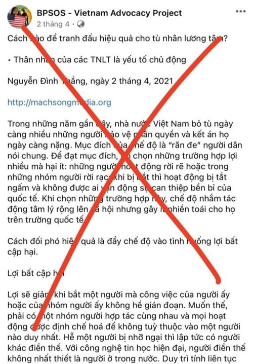 Trong bài viết “Cách nào để đấu tranh hiệu quả cho tù nhân lương tâm” của đối tượng Nguyễn Đình Thắng (chủ tịch của tổ chức “Ủy ban cứu trợ người vượt biển” - BPSOS ở hải ngoại), bài viết đã cho thấy âm mưu xảo quyệt của chúng khi nhấn mạnh “Thân nhân của các TNLT là yếu tố chủ động”. Chúng chỉ đạo số chống đối bên trong động viên, lôi kéo thân nhân và thân hữu của số TNLT là thành phần được chúng cho là tuy chưa có năng lực thực hiện các âm mưu, thủ đoạn chống phá, còn thiếu kinh nghiệm nhưng lại có thể dễ dàng lợi dụng “hoàn cảnh” của mình để bôi xấu uy tín của Đảng và Nhà nước, lên tiếng với quốc tế và có động lực hơn hết để dấn thân trường kỳ cho số “tù nhân lương tâm” ở trong tù và các hoạt động chống phá khác mà không cần kích động, lôi kéo nhiều. Để thực hiện mục tiêu chống phá Nhà nước Việt Nam thì các thế lực thù địch, tổ chức phản động lưu vong rất cần những “vật thế thân” với sự ngây ngô về nhận thức chính trị, sự hám lợi trước mắt, từ đó để “nhồi sọ”, cổ xúy, kích động số này đứng lên chống đối chính quyền một cách mù quáng, quyết liệt.