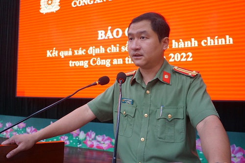 Hội nghị công bố kết quả xác định chỉ số CCHC trong Công an tỉnh (kèm theo Quyết định số 3019/QĐ-CAT ngày 04/11/2022 của Giám đốc Công an tỉnh). Theo tiêu chí xếp hạng, có 20/45 đơn vị xếp loại “Xuất sắc” (tăng 04 đơn vị so với năm 2021); 24/45 đơn vị xếp loại “Tốt” (giảm 02 đơn vị so với năm 2021); 01/45 đơn vị xếp loại “Khá” (giảm 01 đơn vị so với năm 2021); 7/8 lĩnh vực CCHC có chỉ số trung bình tăng so với năm 2021, trong đó 6/8 lĩnh vực có chỉ số đạt trên 95%. Qua đó, cho thấy kết quả tổng thể công tác CCHC của Công an tỉnh năm 2022 có nhiều chuyển biến tích cực, đồng bộ. Từ kết quả xác định chỉ số CCHC trên 08 lĩnh vực cho thấy rõ hơn bức tranh tổng thể kết quả CCHC trong toàn Công an tỉnh và đánh giá thực chất, toàn diện công tác triển khai CCHC của từng đơn vị, Công an huyện, thị xã, thành phố, từ đó giúp người đứng đầu thấy được ưu điểm và tồn tại, hạn chế trong thực hiện CCHC của đơn vị mình để có những điều chỉnh cần thiết về mục tiêu, nội dung và các giải pháp trong triển khai thực hiện, góp phần nâng cao chất lượng, hiệu quả các mặt công tác, đáp ứng yêu cầu, nhiệm vụ thực tiễn.