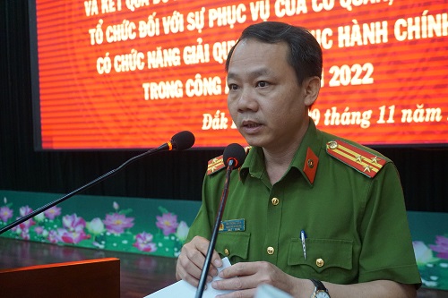 Tiếp đến, Hội nghị đánh giá kết quả khảo sát sự hài lòng của tổ chức, cá nhân đối với sự phục vụ của các đơn vị có chức năng giải quyết TTHC trong Công an tỉnh. Năm 2022, Công an tỉnh được Bộ Công an phân bổ 300 phiếu điều tra xã hội học, trong đó cấp tỉnh 150 phiếu (50%), cấp huyện 105 phiếu (35%), cấp xã 45 phiếu (15%), kết quả khảo sát chỉ số hài lòng của tổ chức, cá nhân đạt 99,95%. Đa số những tổ chức, cá nhân được khảo sát cảm thấy “hài lòng”, “rất hài lòng” đối với sự phục vụ của các cơ quan, đơn vị có chức năng giải quyết TTHC trong Công an tỉnh đối với các tiêu chí được khảo sát. 100% tổ chức, cá nhân được khảo sát cho biết CBCS không gây phiền hà, sách nhiễu và không gợi ý nộp thêm tiền ngoài phí, lệ phí khi thực hiện TTHC; trả kết quả đúng và sớm hẹn (trong đó sớm hẹn là 10,6%, đúng hẹn là 89,4%). Bên cạnh đó, Hội nghị đánh giá cao các đơn vị đã có nhiều đổi mới trong tiếp nhận, giải quyết TTHC và thực hiện các hình thức khảo sát phù hợp như khảo sát trực tuyến trên zalo, mã QR; đồng thời nêu một số phương hướng, giải pháp để khảo sát, đánh giá khách quan, toàn diện hơn sự hài lòng của người dân, từ đó nâng cao sự hài lòng của tổ chức, cá nhân về chất lượng phục vụ.