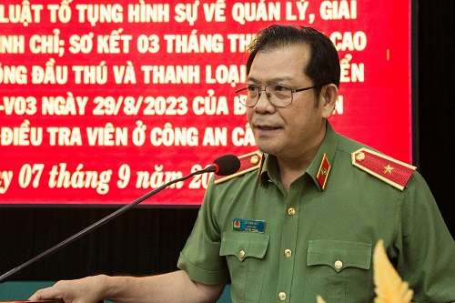 Phát biểu chỉ đạo tại Hội nghị, đồng chí Thiếu tướng Lê Vinh Quy - Bí thư Đảng ủy, Giám đốc Công an tỉnh chỉ đạo các đơn vị, Công an các huyện, thị xã, thành phố cần tập trung triển khai thực hiện hiệu quả công tác quản lý, giải quyết vụ án, vụ việc tạm đình chỉ, phấn đấu kéo giảm từ 05% đến 10% số lượng các vụ án, vụ việc tạm đình chỉ trong năm 2023 và những năm tiếp theo. Thủ trưởng các đơn vị, Công an huyện, thị xã, thành phố chỉ đạo quyết liệt, phân công trách nhiệm cho từng Điều tra viên trong công tác quản lý, giải quyết vụ án, vụ việc tạm đình chỉ; phối hợp chặt chẽ với Viện Kiểm sát nhân dân cùng cấp, nghiên cứu từng hồ sơ để đề ra hướng giải quyết; quản lý chặt chẽ, không để xảy ra tình trạng mất, thất lạc, hư hỏng hồ sơ, tài liệu; tuyệt đối không để xảy ra tình trạng tạm đình chỉ không có căn cứ; kịp thời rà soát, đánh giá, bổ sung tài liệu, chứng cứ và khẩn trương phục hồi giải quyết ngay khi căn cứ tạm đình chỉ không còn. Tăng cường kiểm tra việc chấp hành pháp luật trong công tác quản lý, giải quyết vụ án, vụ việc tạm đình chỉ. Đối với công tác truy nã, cần xác định chỉ tiêu công tác truy nã là một trong những chỉ tiêu công tác quan trọng Bộ Công an, Công an tỉnh giao năm 2023, toàn Công an tỉnh kéo dài thời gian thực hiện cao điểm xác minh truy bắt, vận động đầu thú, thnh loại ĐTTN theo Kế hoạch số 141/KH-CAT-PC01, ngày 29/5/2023 của Công an tỉnh thêm 02 tháng (từ ngày 01/9/2023 - 31/10/2023), cần phải chủ động thực hiện tốt công tác giải quyết tin báo, tố giác về tội phạm, kiến nghị khởi tố, công tác điều tra, xử lý án, hạn chế đến mức thấp nhất việc phát sinh ĐTTN trong giai đoạn điều tra; trường hợp đối tượng bỏ trốn phải khẩn trương tổ chức truy bắt ngay, nếu truy bắt không có kết quả mới ra quyết định truy nã; xây dựng kế hoạch cụ thể, phân công lực lượng, áp dụng đồng bộ các biện pháp nghiệp vụ nhằm thực hiện hiệu quả công tác xác minh, truy bắt ĐTTN. Đối với việc triển khai thực hiện Hướng dẫn số 15/HD-BCA-V03 ngày 29/8/2023 của Bộ Công an về việc bố trí Điều tra viên ở Công an cấp xã, trong tháng 9/2023, khẩn trương bố trí ngay 184 Điều tra viên tại 184 Công an xã, phường, thị trấn trên địa bàn tỉnh. Đồng chí Thủ trưởng Cơ quan Cảnh sát điều tra cấp huyện căn cứ quy định của pháp luật, quyết định và chịu trách nhiệm việc phân công giải quyết tố giác, tin báo về tội phạm và điều tra vụ án hình sự đối với Điều tra viên được bố trí ở Công an cấp xã để đảm bảo yêu cầu về chính trị, pháp luật, nghiệp vụ và yêu cầu giải quyết vụ việc. Phối hợp với Viện kiểm sát nhân dân cùng cấp trong việc kiểm sát các hoạt động tố tụng của Điều tra viên được bố trí ở Công an cấp xã; qua đó, nâng cao chất lượng công tác phòng ngừa, đấu tranh phòng, chống tội phạm ngay từ cơ sở.