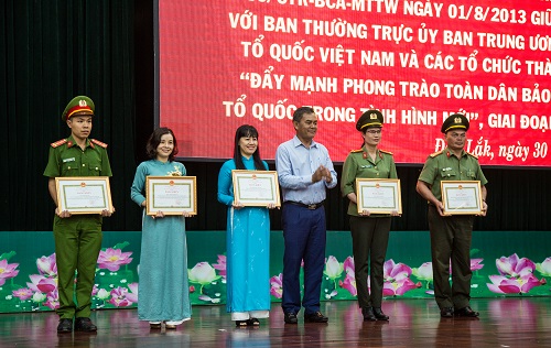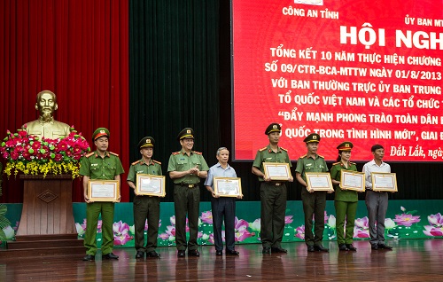 Nhân dịp này, UBND tỉnh Đắk Lắk đã trao tặng bằng khen cho 3 tập thể, 3 cá nhân, Ủy ban Mặt trận Tổ quốc tỉnh trao tặng bằng khen cho 1 tập thể, 2 cá nhân, Giám đốc Công an tỉnh tặng giấy khen cho 7 tập thể, 12 cá nhân đã có thành tích xuất sắc trong 10 năm thực hiện Chương trình phối hợp số 09 ngày 01/8/2013./.