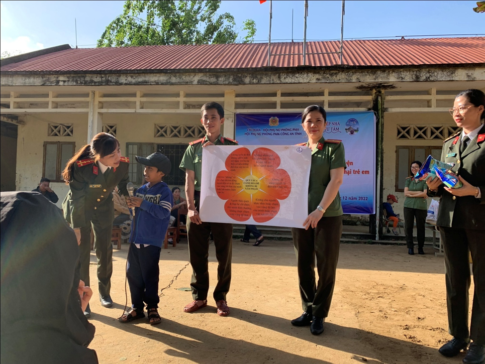 Hướng đến mục tiêu nâng cao nhận thức pháp luật của người dân, nhất là ở các vùng sâu vùng xa, vùng đồng bào dân tộc thiểu số; đồng thời, phát huy tinh thần “lá lành đùm lá rách” của dân tộc ta và tiếp tục thực hiện có hiệu quả phong trào Công an nhân dân học tập và làm theo Sáu điều Bác Hồ dạy gắn với cuộc vận động “Phụ nữ Công an Phú Yên hướng về cơ sở, vì bình yên cuộc sống, giúp đỡ phụ nữ và trẻ em nghèo”, chiều ngày 24/12/2022, Chi đoàn, Hội Phụ nữ Phòng Tham mưu phối hợp với Chi đoàn, Hội Phụ nữ Phòng Kỹ thuật nghiệp vụ, Công an tỉnh tổ chức hoạt động dân vận, xã hội từ thiện “Mùa đông ấm áp 2022 và Xuân tình nguyện 2023 và tuyên truyền pháp luật phòng, chống xâm hại trẻ em” tại Buôn Ly, xã Eatrol, huyện Sông Hinh, tỉnh Phú Yên.Tại chương trình này, đoàn đã tổ chức các hoạt động tuyên truyền pháp luật về phòng, chống xâm hại trẻ em, tặng 25 suất quà (trị giá 200.000 đồng/suất) cho các em có hoàn cảnh khó khăn, tặng 30 mũ bảo hiểm cho giáo viên Trường tiểu học Eatrol, huyện Sông Hinh (trị giá 100.000 đồng/mũ), 150 suất bánh sữa (trị giá 15.000 đồng/suất) cho các em tham gia hoạt động tuyên truyền với tổng trị giá hơn 10 triệu đồng. Một số hình ảnh hoạt động như sau: Hoạt động tuyên truyền về phòng, chống xâm hại trẻ em