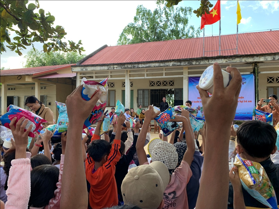 Phát bánh sữa cho các em học sinh tham gia hoạt động