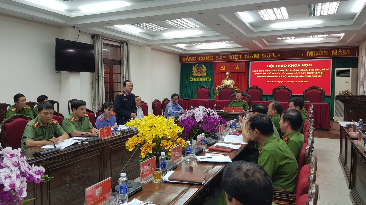 Thay mặt Đảng ủy, lãnh đạo Công an tỉnh, đồng chí Đại tá Thạc sĩ Võ Duy Tuấn - Phó Giám đốc Công an tỉnh báo cáo đề dẫn Hội thảo khoa học, đánh giá tình hình, kết quả công tác phòng ngừa, điều tra xử lý tội phạm giết người và cố ý gây thương tích do nguyên nhân xã hội đã và đang trở thành vấn đề thực tiễn đặt ra đối với công tác bảo vệ ANQG, bảo đảm TTATXH của lực lượng Công an Phú Yên. Đồng thời, nêu rõ mục đích, yêu cầu, mục tiêu của cuộc Hội thảo nhằm đưa ra những giải pháp góp phần nâng cao hiệu quả công tác phòng ngừa, điều tra xử lý tội phạm giết người và cố ý gây thương tích trong thời gian tới.Hội thảo có 22 báo cáo tham luận được chuẩn bị chu đáo, công phu và nhiều ý kiến phát biểu thảo luận của các đại biểu, trong đó có các ý kiến thảo luận đánh giá tình hình tội phạm chung cả nước của Cục Cảnh sát hình sự - Bộ Công an; nguyên nhân xã hội dẫn đến tình hình tội phạm đứng dưới góc độ xã hội và tội phạm học và các đại biểu ở địa bàn cơ sở là những ý kiến hết sức tâm huyết, trách nhiệm, cung cấp nhiều cơ sở khoa học giải quyết mối quan hệ giữa lý luận và thực tiễn; đánh giá làm rõ thực trạng và nguyên nhân xã hội tình hình tội phạm giết người, tội phạm cố ý gây thương tích trên địa bàn tỉnh Phú Yên, nhất là mâu thuẫn nội bộ trong Nhân dân, mâu thuẫn gia đình, mâu thuẫn tình cảm, tranh chấp đất đai, quản lý đối tượng nghiện ma túy…; nhiều vụ án giết người xảy ra trong thời gian qua đã được đưa ra xét xử với mức án nghiêm khắc, góp phần răn đe, phòng ngừa xã hội, trong đó đã tuyên án tử hình đối với 02 đối tượng có hành vi giết người với tính chất man rợ, gây bức xúc trong xã hội.