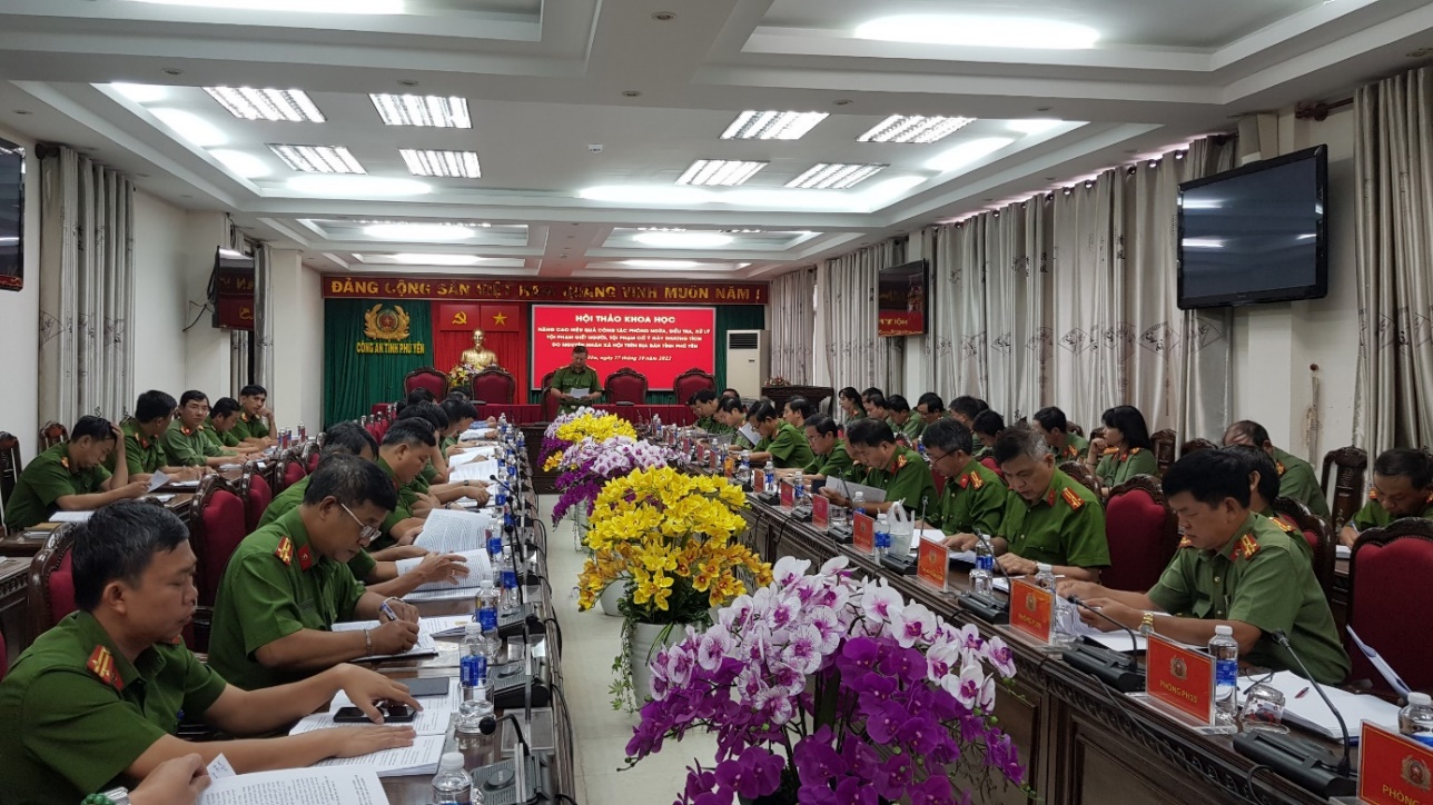 Sáng ngày 27/10/2022, Công an tỉnh Phú Yên tổ chức Hội thảo khoa học “Nâng cao hiệu quả công tác phòng ngừa, điều tra, xử lý tội phạm giết người, tội phạm cố ý gây thương tích do nguyên nhân xã hội trên địa bàn tỉnh Phú Yên”. Đồng chí Đại tá Thạc sĩ Võ Duy Tuấn - Phó Giám đốc, Thủ trưởng Cơ quan Cảnh sát điều tra Công an tỉnh chủ trì; tham dự Hội thảo có đồng chí Đại tá Thạc sĩ Nguyễn Thái Hoàng - Phó Giám đốc Công an tỉnh; Thượng tá, Phó Giáo sư, Tiến sĩ Bùi Thành Chung - Phó Trưởng Khoa Cảnh sát hình sự Trường Đại học Cảnh sát nhân dân; đại diện Cục Cảnh sát hình sự - Bộ Công an, Trường Cao đẳng Cảnh sát nhân dân II, đại diện lãnh đạo Ban Nội chính Tỉnh ủy, Tòa án nhân dân tỉnh, Viện Kiểm sát nhân dân tỉnh, đại diện lãnh đạo và chỉ huy Đội Điều tra tổng hợp, Đội Cảnh sát hình sự Công an các đơn vị, địa phương.