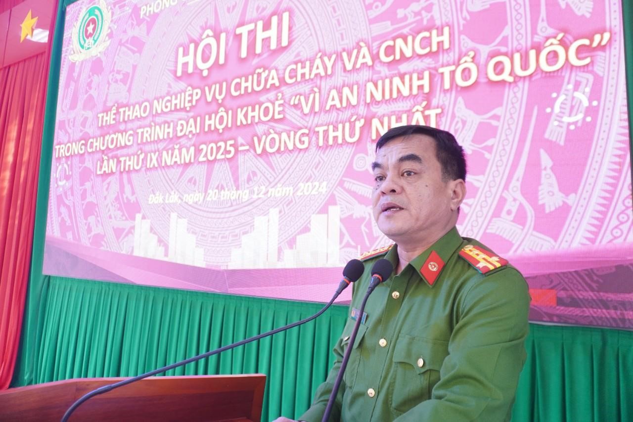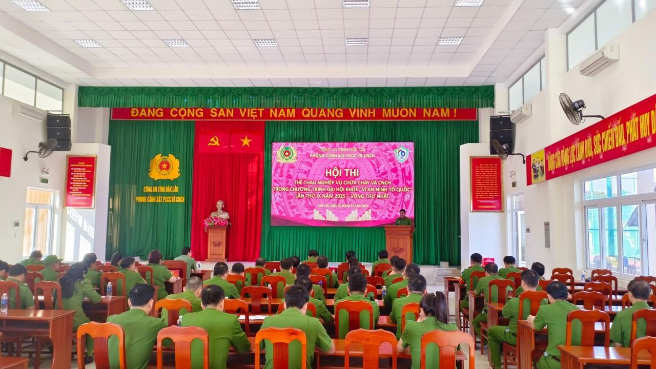 Vừa qua, Công an tỉnh Đắk Lắk đã tổ chức thành công Hội thi Thể thao Nghiệp vụ chữa cháy và CNCH trong Chương trình Đại hội khỏe “Vì An ninh Tổ quốc” lần thứ IX năm 2025 - Vòng thứ nhất. do đồng chí Đại tá Y San Adrơng - Phó Giám đốc Công an tỉnh chủ trì. Dự Hội thi có đại diện Lãnh đạo Phòng Tham mưu, lãnh đạo Phòng Cảnh sát Phòng cháy chữa cháy và cứu nạn cứu hộ (PCCC và CNCH), lãnh đạo Công an huyện, thị xã, thành phố và đặc biệt, sự tham gia của 48 vận động viên là lãnh đạo, chỉ huy các đơn vị, Công an cấp huyện.
