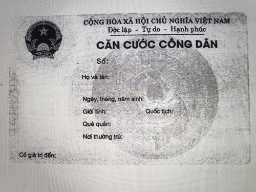 Mặt trước của thẻ Căn cước công dân gồm các thông tin sau: Bên trái, từ trên xuống: hình Quốc huy nước Cộng hòa xã hội chủ nghĩa Việt Nam, đường kính 14mm; ảnh của người được cấp thẻ Căn cước công dân cỡ 20mm x30mm, có giá trị đến. Bên phải, từ trên xuống: CỘNG HÒA XÃ HỘI CHỦ NGHĨA VIỆT NAM, Độc lập - Tự do - Hạnh phúc; dòng chữ “CĂN CƯỚC CÔNG DÂN”, số; họ và tên; ngày, tháng, năm sinh; giới tính; quốc tịch; quê quán; nơi thường trú.