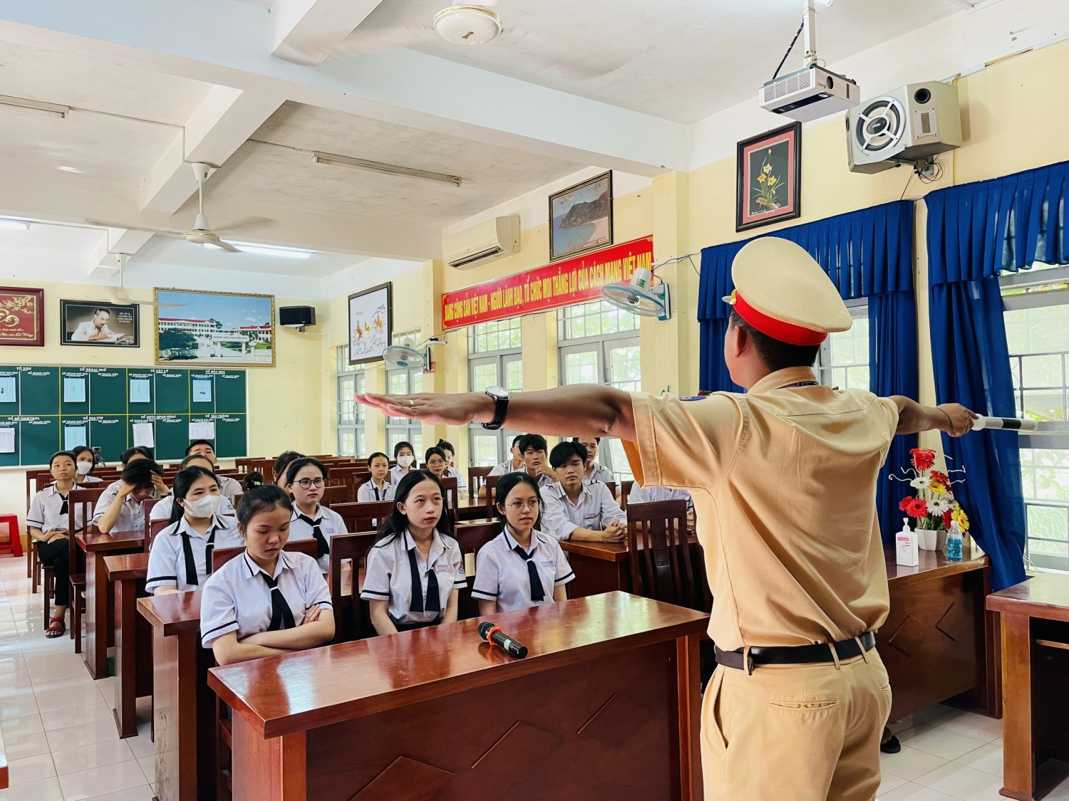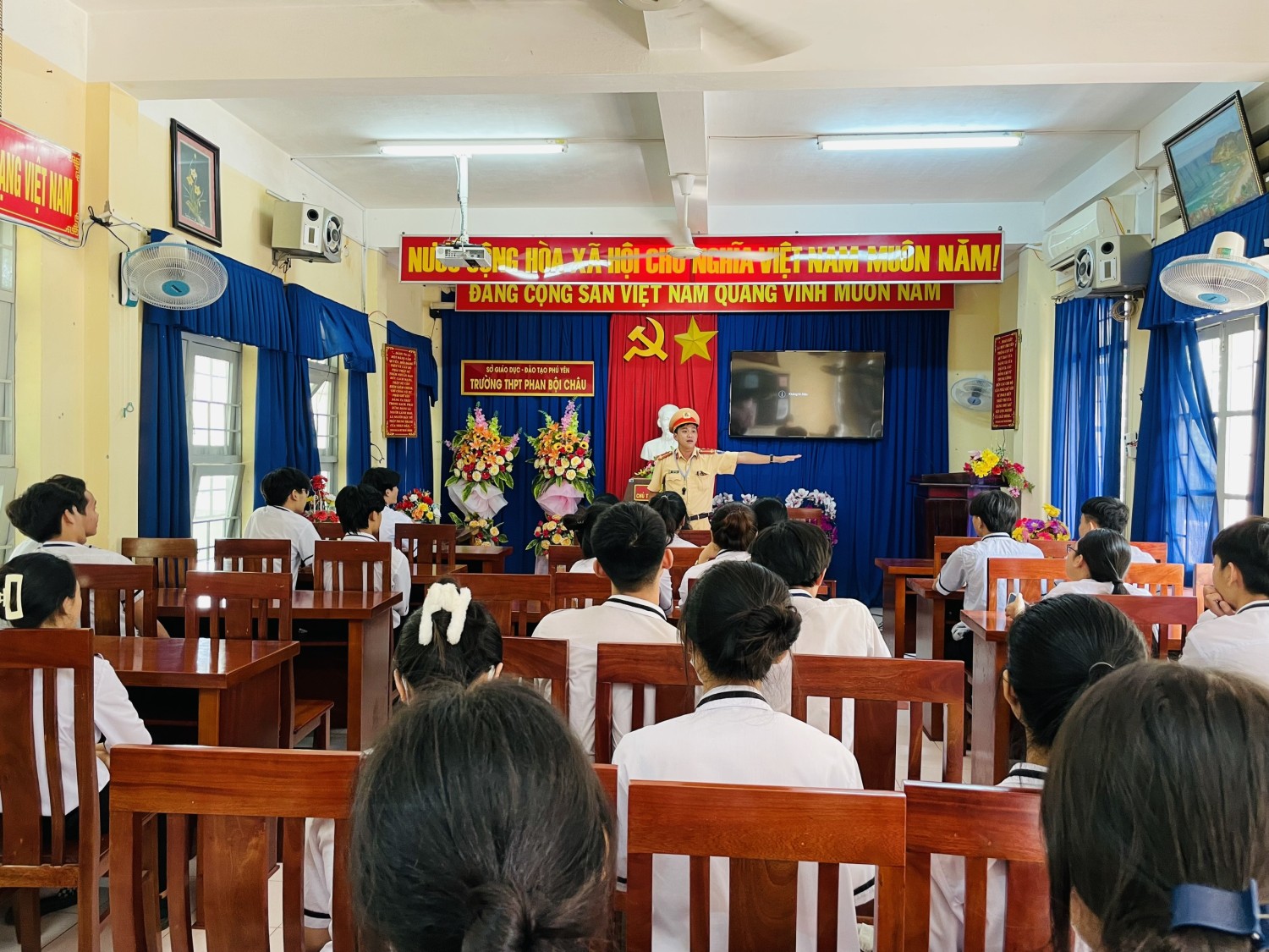 Phòng Cảnh sát Giao thông Công an tỉnh vừa phối hợp với Trường THPT Phan Bội Châu, huyện Sơn Hoà tổ chức hướng dẫn chỉ huy điều khiển giao thông .