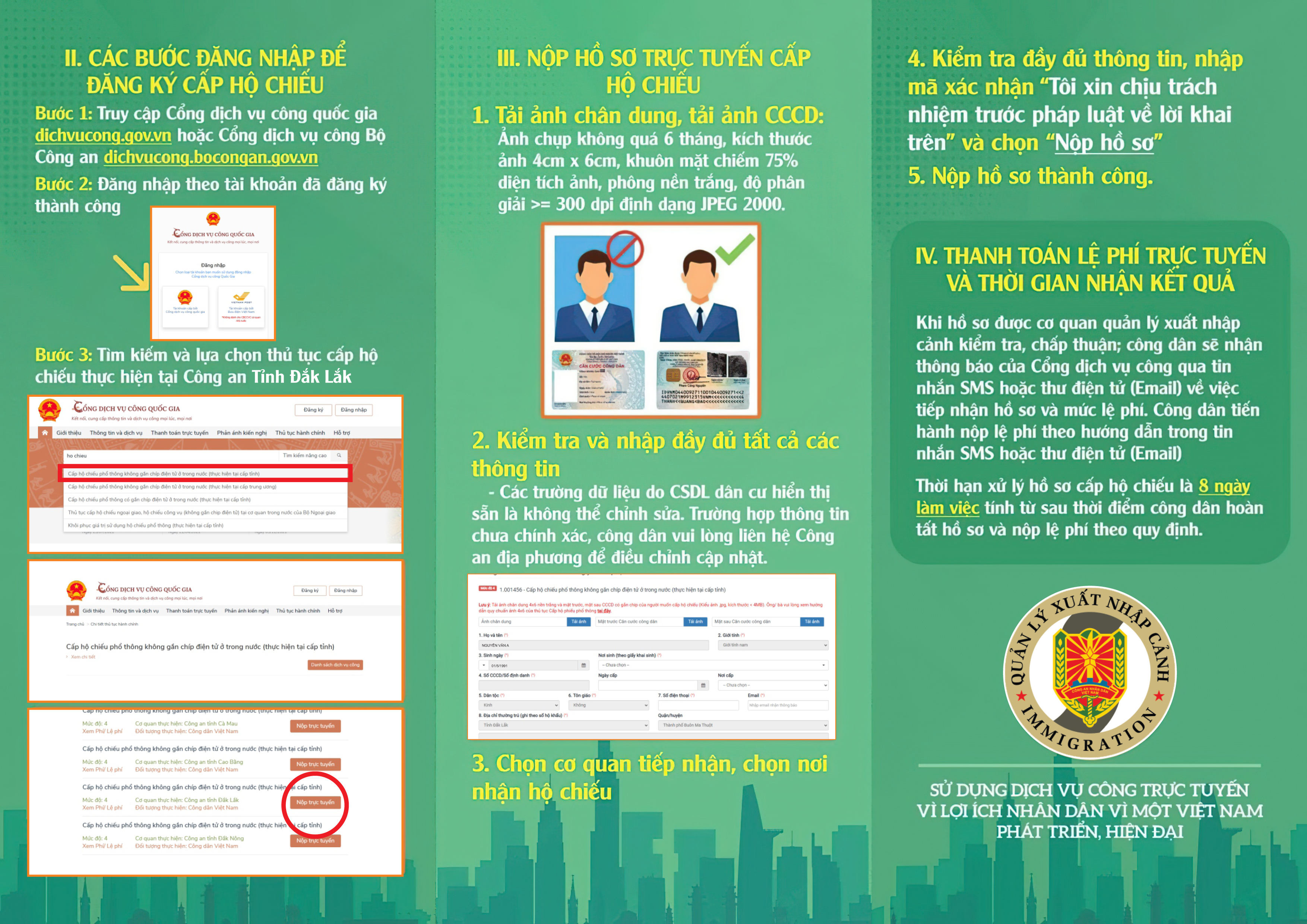 Từ ngày 01/6/2022, Bộ Công an triển khai thực hiện cấp hộ chiếu phổ thông không gắn chíp điện tử ở trong nước mức độ 4. Đây là bước chuyển đổi số lớn trong công tác quản lý xuất nhập cảnh được Bộ Công an triển khai tích cực trong thời gian qua. Để tạo điều kiện thuận lợi cho người dân tiếp cận, thực hiện dịch vụ công, phòng Quản lý xuất nhập cảnh hướng dẫn thủ tục, cách thức thực hiện cụ thể như sau: