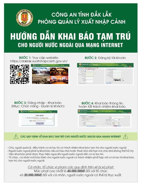 Phòng Quản lý xuất nhập cảnh đề nghị tất cả các cơ sở lưu trú, cơ quan, doanh nghiệp, hộ gia đình thường xuyên có NNN về thăm thân chủ động đăng ký tài khoản tại Trang thông tin điện tử về khai báo tạm trú của Phòng Quản lý xuất nhập cảnh - Công an Đắk Lắk để thực hiện khai báo đầy đủ, đúng quy định khi có NNN đến lưu trú, theo hướng dẫn sau: