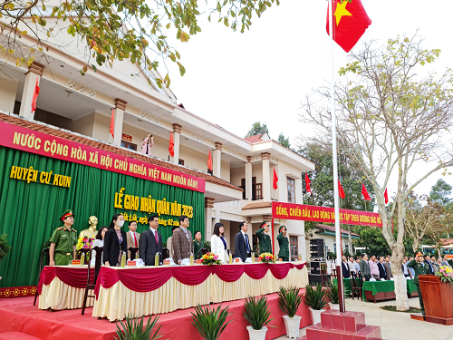 Hòa trong không khí phấn khởi của những ngày đầu xuân năm mới. Sáng ngày 08/02/2022, Ủy ban nhân dân huyện Cư Kuin long trọng tổ chức Lễ giao nhận quân, tiễn chân các thanh niên ưu tú của huyện nhà lên đường nhập ngũ. Về dự Lễ giao nhận quân có đồng chí H’Dim Kđoh, Phó Chủ tịch UBND tỉnh; đại diện Ban Chỉ huy quân sự tỉnh; đồng chí Lê Thái Dũng, Bí thư huyện ủy; đồng chí Võ Tấn Huy, Chủ tịch UBND huyện; đồng chí Nguyễn Thị Thúy Liễu, Chủ tịch HĐND huyện; tập thể lãnh đạo chỉ huy BCH quân sự huyện; Công an huyện Cư Kuin và đại diện các ban ngành đoàn thể; Chỉ huy và cán bộ, chiến sĩ các đơn vị nhận quân; đại biểu đại diện cho cấp ủy, chính quyền, mặt trận Tổ quốc, Hội đồng nghĩa vụ quân sự, các ban, ngành, đoàn thể các xã và các đồng chí tân binh thực hiện nghĩa vụ quân sự và Công an nhân dân năm 2023.
