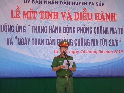 Tới dự và chỉ đạo Lễ mít tinh có đồng chí Nguyễn Hoàng Vũ, Phó Bí thư Huyện ủy, Chủ tịch Hội đồng nhân dân huyện; đại diện lãnh đạo UBND huyện, các cơ quan, ban, ngành của huyện cùng hơn 300 đoàn viên khôi sực lượng vũ trang và đoàn viên thanh niên khối trường học. Tại buổi Lễ, sau phần phát biểu chỉ đạo của đồng chí Nguyễn Văn Nhiệm, Ủy viên Ban Thường vụ Huyện ủy, Phó Chủ tịch thường trực UBND huyện, đồng chí Thượng tá Trần Mạnh Hiếu, Phó Trưởng Công an huyện, đại diện cho lực lượng trực tiếp đấu tranh phòng, chống tội phạm và tệ nạn ma túy cùng lãnh đạo Huyện đoàn Ea Súp, đại diện cho tuổi trẻ huyện nhà đã phát biểu hưởng ứng “Tháng hành động phòng chống ma túy” và Ngày toàn dân phòng chống ma túy 26/6.