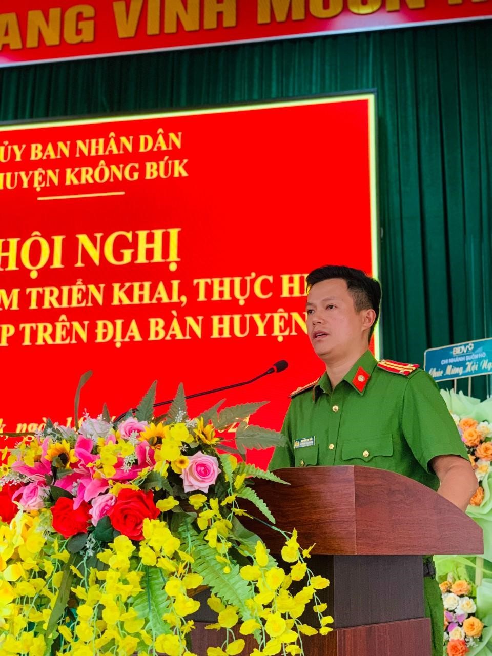 Đ/c Trung tá Nguyễn Kim Thái - Phó trưởng Công an huyện thông qua bản tóm tắt Báo cáo sơ kết 02 năm triển khai,thực hiện Đề án 06/CP trên địa bàn
