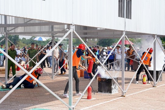 Đối với phần thi thực hành, các thành viên của đội thi cùng phối hợp thực hiện các thao tác chữa cháy, cứu người và di chuyển tài sản đối với loại hình nhà để ở kết hợp sản xuất, kinh doanh. Phần thi này đòi hỏi các đội thi phải có sự phân công nhiệm vụ nhịp nhàng, các vận động viên có sức khỏe tốt, dũng cảm, nhanh nhẹn để thực hiện chính xác, nhanh gọn những thao tác quan trọng trong công tác chữa cháy và CNCH như: báo động có cháy, đeo mặt nạ phòng độc, cắt khóa cửa, tiếp cận và đưa người bị nạn đến nơi an toàn, sử dụng bình chữa cháy dập lửa, di chuyển tài sản ra khỏi đám cháy… Kết quả: Đội thi xã Krông Búk giành giải nhất thực hành.