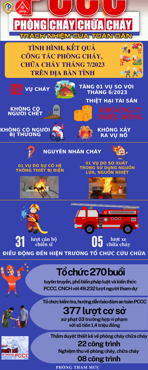 Infographic]: Tình hình, kết quả công tác phòng cháy, chữa cháy tháng 7 năm 2023 trên địa bàn tỉnh