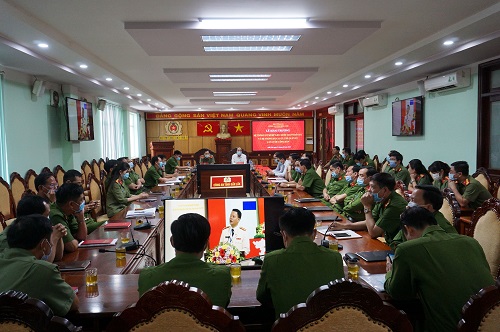 Đồng chí Đại tá Nguyễn Văn Bình - Phó Giám đốc Công an tỉnh báo cáo tiến trình trình thực hiện các hệ thống dữ liệu tại hội nghị trực tuyến