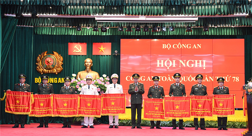 Các đồng chí Thứ trưởng Bộ Công an: Thượng tướng Trần Quốc Tỏ, Uỷ viên Trung ương Đảng; Trung tướng Nguyễn Duy Ngọc, Uỷ viên Trung ương Đảng; Trung tướng Lê Quốc Hùng, Thiếu tướng Lê Văn Tuyến, Thiếu tướng Nguyễn Văn Long đã trao Cờ thi đua của Bộ Công an tặng 44 Công an các đơn vị, địa phương.