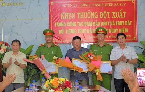 Ngày 16/7/2023, tại UBND xã Ea Lê, Huyện ủy, HĐND, UBND huyện đã khen thưởng đột xuất cho tập thể cán bộ chiến sĩ Công an huyện, UBND xã và Công an xã Ea Lê vì đã có thành tích đặc biệt xuất sắc trong công tác truy bắt 3 đối tượng truy nã đặc biệt nguy hiểm liên quan đến vụ khủng bố xảy ra vào ngày 11/6/2023 tại huyện Cư Kuin.