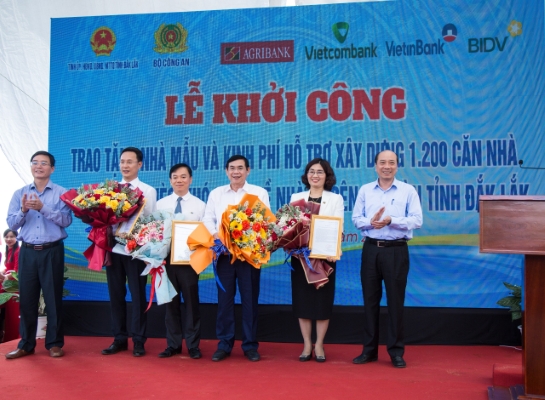 Các đồng chí lãnh đạo Bộ Công an và tỉnh Đắk Lắk trao kinh phí hỗ trợ xây 1.200 căn nhà.