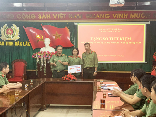 Ngày 12/9/2022, Khối thi đua số III, Công an tỉnh Đắk Lắk tổ chức Lễ trao tặng sổ tiết kiệm cho đồng chí Đại úy Lê Thị Kim Chi - Cán bộ Phòng An ninh chính trí trị nội bộ trị giá 60 triệu đồng, được trích từ nguồn kinh phí hoạt động của Khối thi đua số III do CBCS trong khối đóng góp.