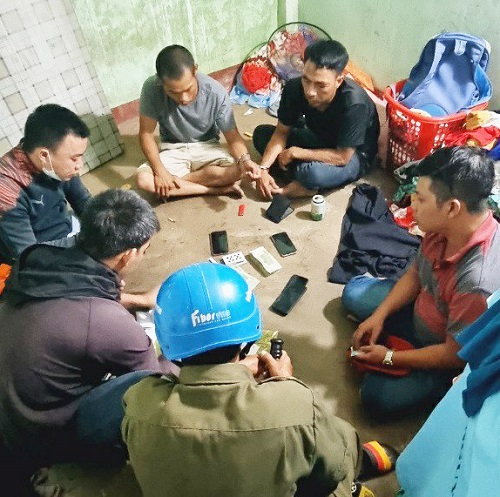 Các đối tượng đánh bạc cùng tang vật tại hiện trường