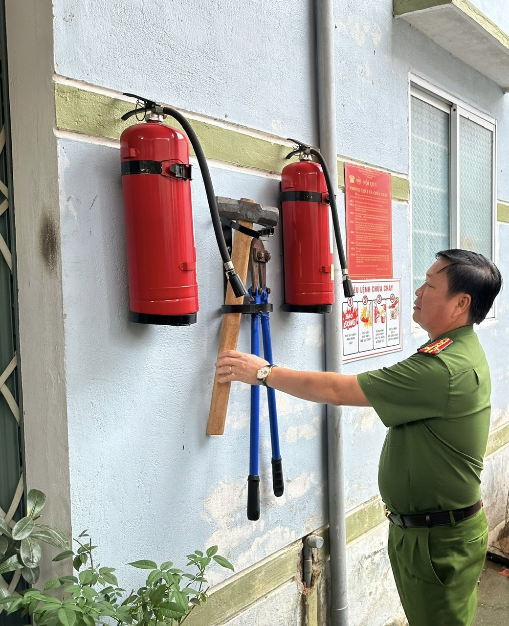 Đồng chí Đại tá Nguyễn Thái Hoàng, Phó Giám đốc Công an tỉnh kiểm tra thực tế mô hình “Tổ liên gia an toàn PCCC” và “Điểm chữa cháy công cộng” tại địa phương.