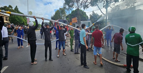 Lực lượng Công an phối hợp với người dân tham gia chữa cháy.