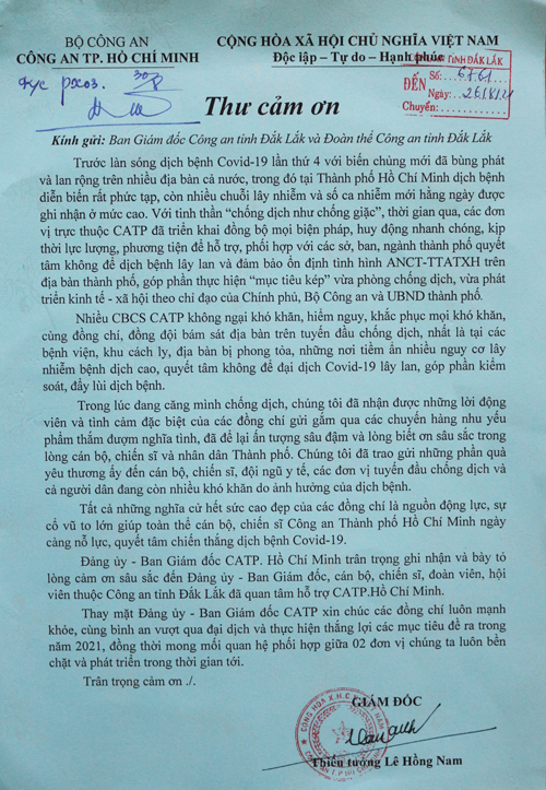 Những món quà ý nghĩa này của cán bộ, chiến sĩ Công an tỉnh Đắk Lắk đã được Công an thành phố Hồ Chí Minh trân trọng đón nhận và gửi Thư cảm ơn, trong thư có đoạn viết: “Trong lúc đang căng mình chống dịch, chúng tôi đã nhận được những lời động viên và tình cảm đặc biệt của các đồng chí gửi gắm qua các chuyến hàng nhu yếu phẩm thắm đượm nghĩa tình, để lại ấn tượng sâu đậm và lòng biết ơn sâu sắc trong lòng cán bộ, chiến sĩ và nhân dân Thành phố. Tất cả những nghĩa cử hết sức cao đẹp của các đồng chí là nguồn động lực, sự cổ vũ to lớn giúp toàn thể cán bộ, chiến sĩ Công an Thành phố Hồ Chí Minh ngày càng nỗ lực, quyết tâm chiến thắng dịch bệnh Covid-19”./.