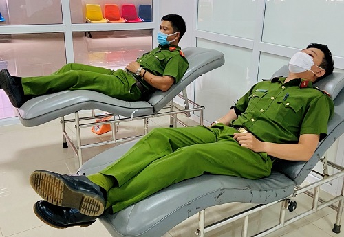 2 đồng chí Nguyễn Ngọc Ánh và Trung uý Phan Duy Khánh hiến máu giúp anh Nông Văn Hội