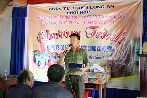 Ngày 02/11/2019, đoàn từ thiện Long An phối hợp Phòng Kỹ thuật hình sự Công an tỉnh cùng Đoàn thanh niên, Công an xã Cư Êwi tổ chức chương trình “Hướng về cơ sở, chung sức vì cộng đồng” tại địa bàn xã Cư Êwi, huyện Cư Kuin.