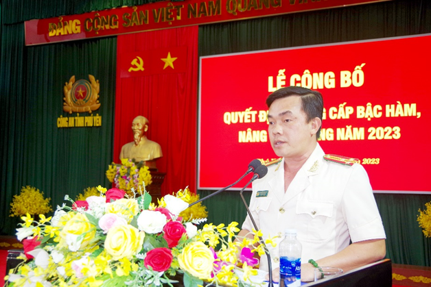 Thay mặt Đảng ủy, lãnh đạo Công an tỉnh, Đại tá Phan Thanh Tám - Ủy viên Ban Thường vụ Tỉnh ủy, Bí thư Đảng ủy, Giám đốc Công an tỉnh chúc mừng cán bộ chiến sĩ được thăng cấp bậc hàm, nâng bậc lương, khẳng định đây là sự ghi nhận của Bộ Công an, Giám đốc Công an tỉnh đối với những đóng góp, nỗ lực và cố gắng phấn đấu vươn lên trong quá trình công tác, chiến đấu của mỗi cán bộ, chiến sĩ trong suốt niên hạn vừa qua. Giám đốc Công an tỉnh mong muốn các đồng chí tiếp tục nâng cao tinh thần trách nhiệm, nỗ lực hơn nữa trong công tác, không ngừng tu dưỡng, rèn luyện, phấn đấu vươn lên, hoàn thành tốt mọi nhiệm vụ được giao, góp phần cùng toàn lực lượng Công an Phú Yên giữ vững an ninh chính trị, trật tự an toàn xã hội trên địa bàn.