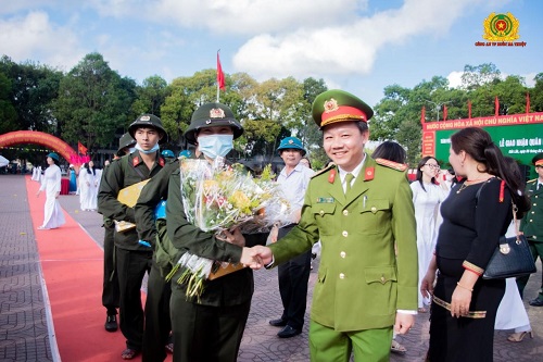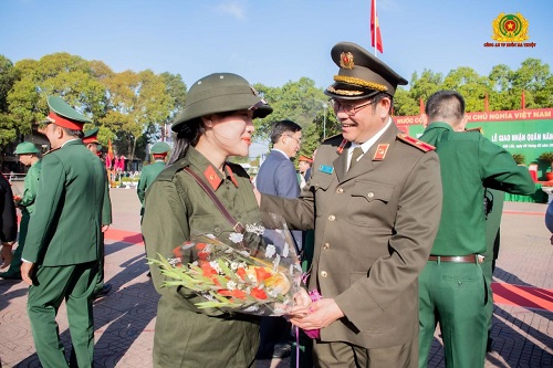 Đ/c Thiếu tướng Lê Vinh Quy - Ủy viên BTV Tỉnh ủy, Giám đốc Công an tỉnh,tặng hoa nữ tân binh duy nhất tham gia nghĩa vụ CAND