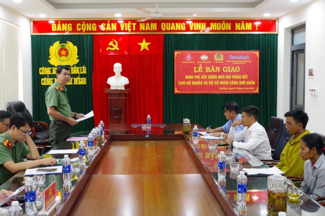 Thực hiện Kế hoạch phân bổ Quỹ “Vì người nghèo” cấp tỉnh, phát huy tinh thần “Tương thân tương ái”, hưởng ứng Phong trào “Cả nước chung tay vì người nghèo - Không để ai bị bỏ lại phía sau”, ngày 27/3/2024, Công an huyện Cư M’gar phối hợp Ủy ban Mặt trận Tổ quốc Việt Nam tỉnh Đắk Lắk, Công an tỉnh Đắk Lắk và Ngân hàng Thương mại cổ phần Sài Gòn Thương Tín - Chi nhánh Đắk Lắk phối hợp trao kinh phí hỗ trợ xây nhà ở Đại đoàn kết cho 03 hộ gia đình nghèo, có hoàn cảnh khó khăn trên địa bàn huyện Cư M’gar.