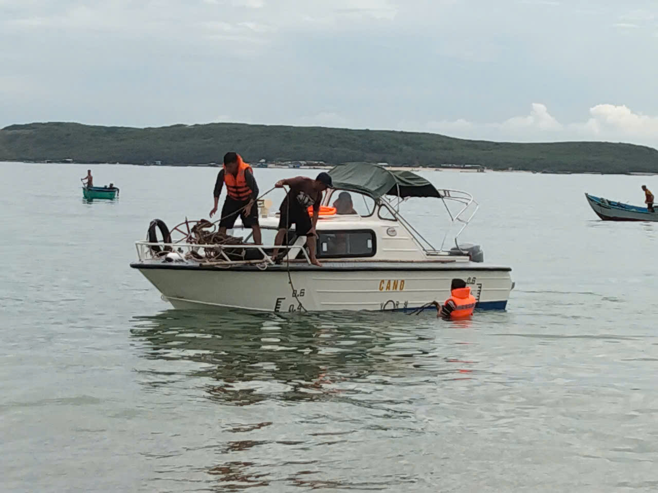 Lực lượng Cảnh sát cơ động tìm kiếm thúng chai bị chìm.