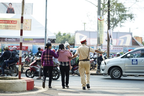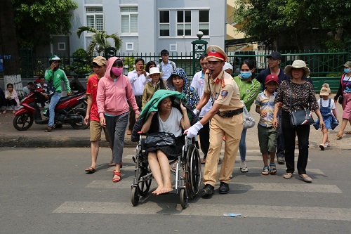 Cảnh sát giao thông dẫn phụ nữ, trẻ em, người già, người khuyết tật qua đường