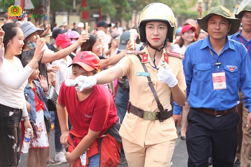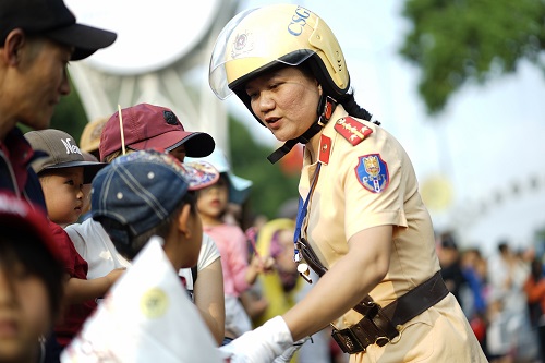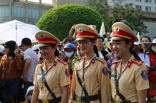 Các nữ Cảnh sát giao thông tham gia bảo đảm trật tự, an toàn giao thông với gương mặt tươi tắn tạo được nhiều thiện cảm với người dân và du khách